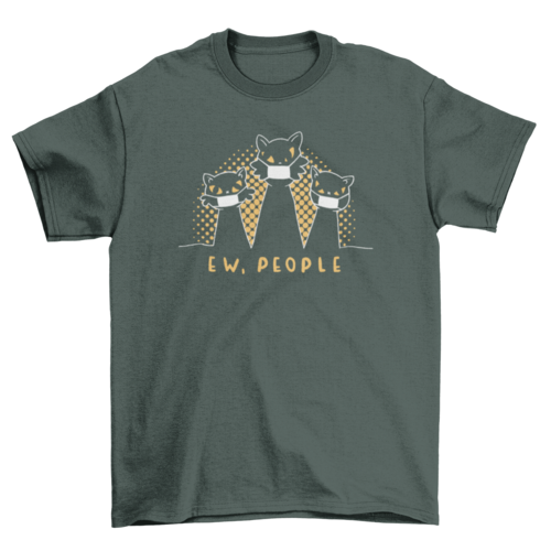 Funny t-shirt design that includes an illustration of three cats wearing face masks with the caption "Ew people".
