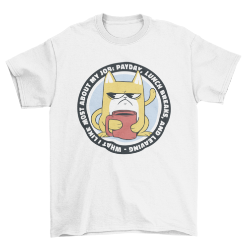 Funny working cat t-shirt design of a cat drinking coffee and the quote "What I like most about my job: payday, lunch breaks, and leaving".