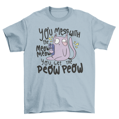 Funny t-shirt design featuring a cat holding a gun with the quote "You mess with the meow meow, you get the peow peow"