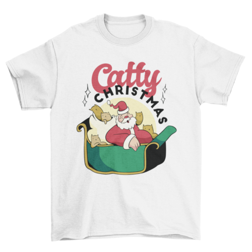 Beautiful t-shirt design of Santa Claus surrounded by kitties on his sled and the quote 'Catty Christmas'.